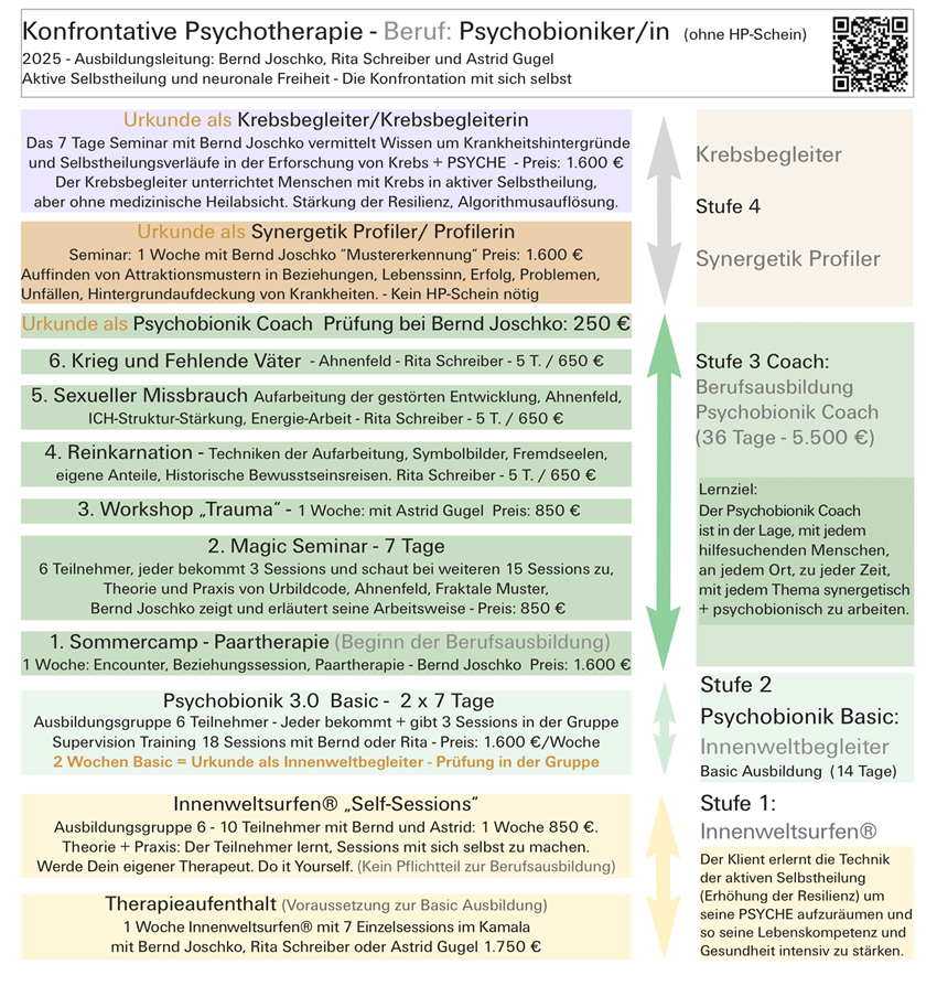 Die Weiterentwicklung der Synergetik Therapie nennt sich Psychobionik 3.0 und wird als Unterricht gelehrt: "Heile Dich selbst" - die anderen können es nicht für Dich tun. Wir zeigen es Dir, wie es geht. Seit 2018 gibt es wieder eine Synergetik Profiler Ausbildung auf der Basis der Psychobionik 3.0 - Bisher haben 7 Teilnehmer diese Qualifikation erreicht. |