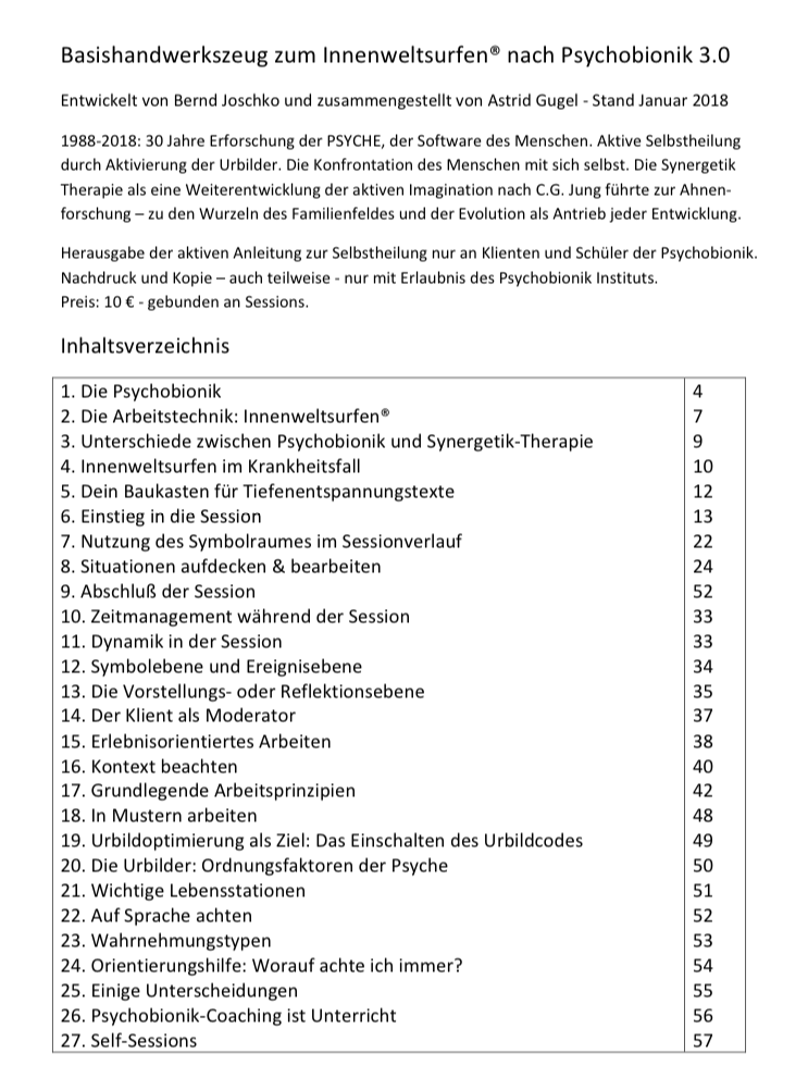 der PSYCHE - Inhaltsverzeichnis Hier das Basishandwerkszeug zur Innenweltarbeit für Menschen, die sich selbst heilen wollen. Alle Erkenntnisse und Gesetzmäßigkeiten im Überblick zur praktischen Anwendung. Dieses Heft mit 60 A4 Seiten gibt es für 10 € beim Bernd Joschko Verlag oder den Psychobioniker zu kaufen, wenn eine Session dazu absolviert wird. Die neue erlebnisorientierte Psychotherapie ist da. Buchen Sie eine Therapiewoche, um sie praktisch zu erfahren und somit die Grundlagen zu erlernen. Von den höchsten Gerichten in Deutschland positiv bewertet und in weiten Bereichen ohne HP-Schein frei anwendbar. Selbstheilung: Niemand kann Dich heilen - nur Du selbst. Selbst wenn Du Krebs hast, braucht es gerade Dich, denn Krebs fällt nicht vom Himmel. Der neue Trend: Heile-Dich-selbst.de |