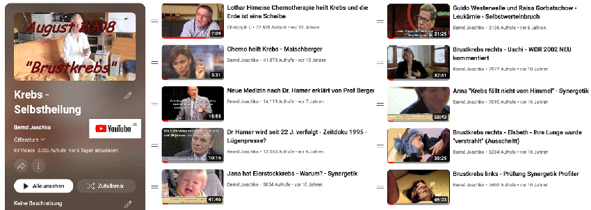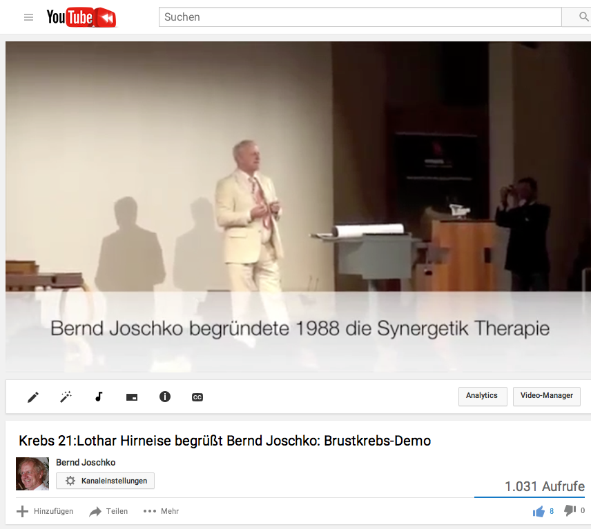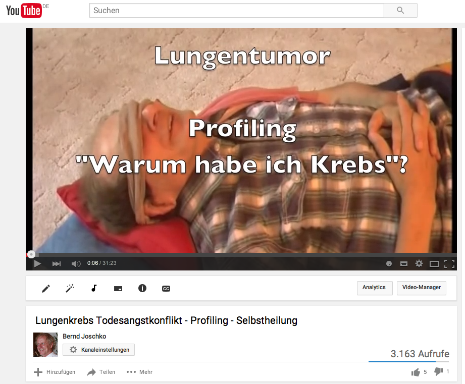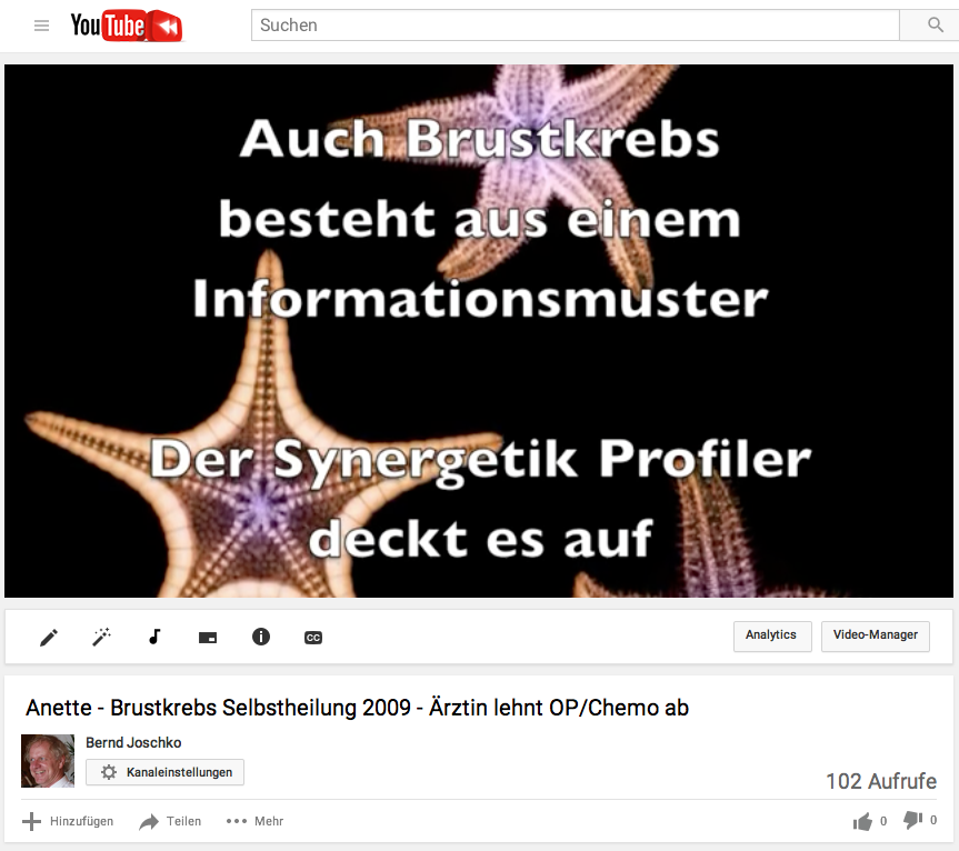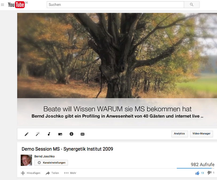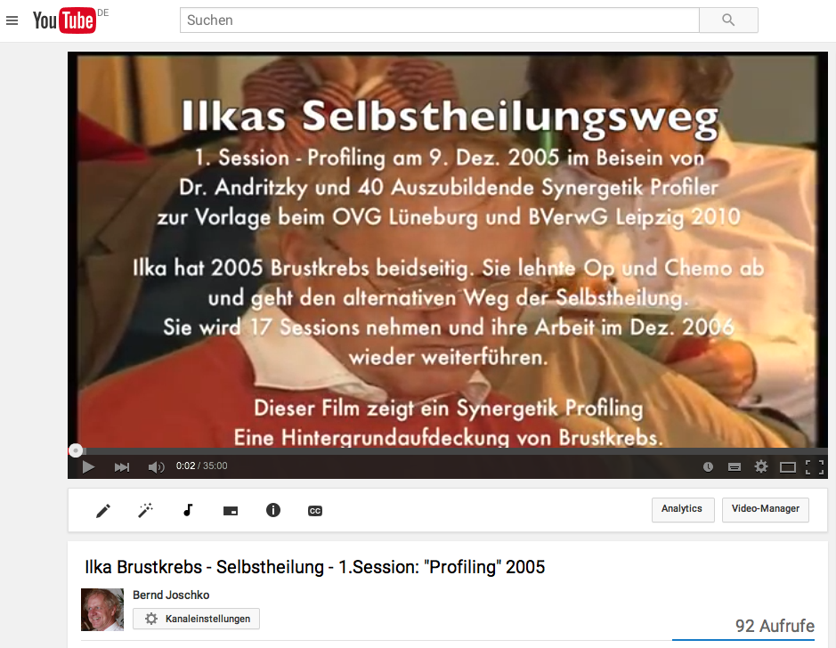 Echte Heilung ist immer Selbstheilung. Eine Methode kann nur dabei helfen. Daher kann niemand heilen - die Schulmedizin schon mal garnicht. Sie bekämpft nur die Symptome. Wer weiß schon im Einzelfall, ob die Chemo beim Überleben oder Sterben geholfen hat. Jeder muß sich selbst heilen, denn sein Leben hat ihn krank gemacht. Also gilt es als erstes herauszufinden, was im Hintergrund arbeitet - im Gedächtnisspeicher PSYCHE. Dazu wurde der Synergetik Profiler schon 2001 von Bernd Joschko entwickelt. Er deckt präzise auf. Die nebenstehende Playlist von Youtube startete vor 10 Jahren und zeigt 80 Beispiele. Die Videos wurden ca. 250.000 mal angeklickt. |